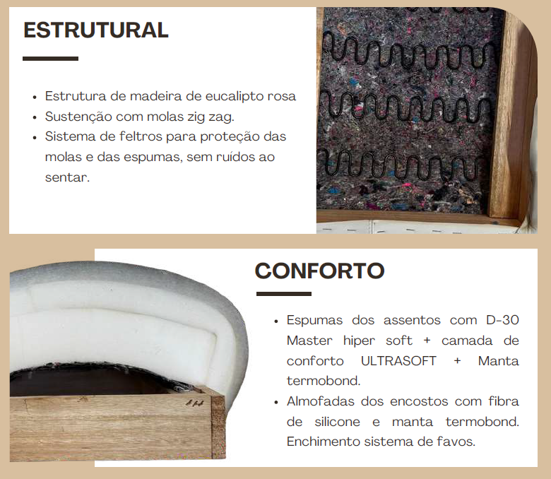Assento fixo, com molas zigzag, protegidas com feltro, espuma D 30 soft + camada de soft + camada de manta acrilica.